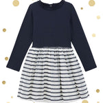 • This dress has a bodice in plain cotton that's accented with ruching at the necklineThe ballerina skirt is made in structured tulle featuring Petit Bateau's favourite bretonstripe. Model is lined.